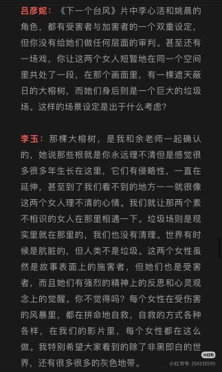 《下一个台风》无疑是李玉创作道路上一次具有转折意义的重要尝试,它既凸显了其作为女性导演在议题选择与情感表达上的独特视角与艺术勇气,也折射出她在驾驭多重社会隐喻与类型叙事时的结构性局限。 在现实主义力度的呈现上,影片虽直面性侵、网暴、二次伤害等社会痛点,却因对系统性暴力的剖析停留在隐喻层面,未能实现更具社会穿透力的批判,从而呈现出某种叙事落差。 尽管如此,电影试图打破沉默、直面个体与历史创伤的努力仍具有不可忽视的价值。在台风过境后的寂静之中,这部电影至少让观众得以更清晰地听见那些曾被喧嚣所淹没的低声部叙事——这或许正是其作为作者电影最值得肯定的意义所在。
