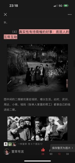 张举人首先提出三点反对意见:a.穷人要干活,没空读书。如果穷人都不去割草放牛、捡柴拾粪,那么耽搁的可是他们庄家的收成。b.中国讲求三纲五常,上是上,下是下。孔子说:“民可使由之,不可使知之。”孟子说:“劳心者治人,劳力者治于人。”穷人识字多,就会出现第二个洪秀全。c.武训是个疯癫的叫花子,钱款多是招摇撞骗而来,应把其钱充公,修一个文昌大帝庙,保证读书人“修身齐家治国平天下”。 年轻的郭芬听闻此言,在众人犹疑时站出来发言,提出两点反驳:a.武训多年来从未把钱用于自身的享乐,而是为了让他人读书。如果说他是骗子,那么社会上像这样大公无私、悲天悯人的骗子还太少。b.读书人应明白民为邦本的道理,他们所有吃穿住行,都是庄稼人供出来的,怎么能这么不体恤他们。眼看着张举人下不来台,他身旁的小跟班插嘴道:“办义学学的是义书,讲的是圣贤的道理,这是办好事。”这里面值得探讨的地方有很多,我简单提出三点:a.张举人所说之言都有其道理,如今许多地方仍有“读书无用论”,在义务教育结束后,为了家庭生计,许多人都放弃了学业,因为他们也有自己的牛要。孔孟之言,我理解的同张举人并没本质上的不同,毕竟这是封建时代的产物,肯定是要维护封建统治。某种程度上来说,这两句也算是“厚黑学”的真理了,古往今来,还没人能跳出其预言。